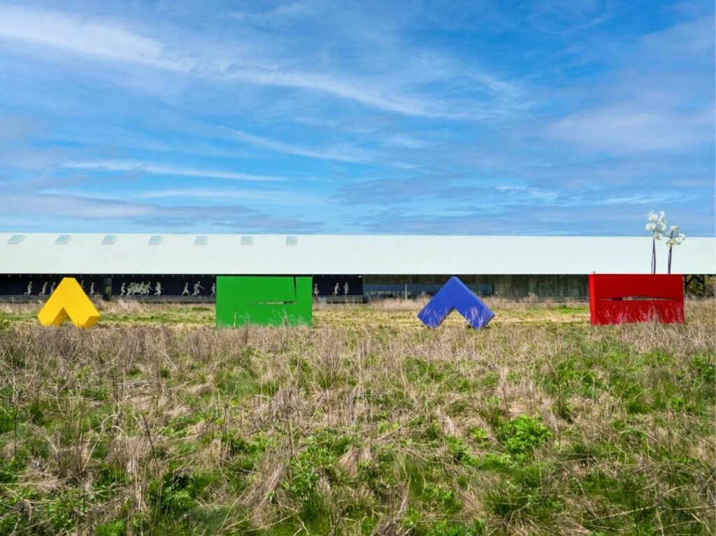 Serie Estructuras, de Carmen Herrera en los prados del Museo Parrish de Water Mill. Imagen: Museo Parrish de Water Mill.