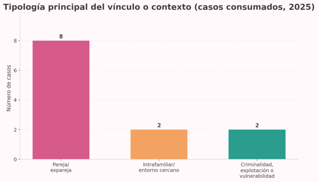 Se identifican tres patrones principales. El primero es el feminicidio íntimo, cometido por parejas o exparejas, que sigue siendo la forma predominante. El segundo es la violencia intrafamiliar o del entorno cercano, donde el agresor es un padrastro, yerno u otra figura masculina con acceso cotidiano a la víctima. El tercero corresponde a asesinatos de mujeres cubanas en contextos de criminalidad, explotación o extrema vulnerabilidad migratoria, que no siempre encajan en la tipología clásica de pareja, pero sí forman parte de la violencia feminicida en sentido amplio.
