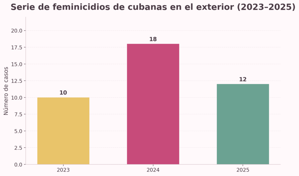 Estos datos deben entenderse en continuidad con los registros elaborados por OGAT y YSTCC. En 2023 los observatorios documentaron 10 feminicidios de cubanas en el exterior, incluidos 2 transfeminicidios. En 2024 documentaron 18 feminicidios de cubanas en el exterior. La cifra provisional de 2025 es menor, pero no puede leerse automáticamente como descenso del fenómeno, porque la visibilidad de estos casos depende de la circulación pública de la información, del acceso a fuentes locales y de la posibilidad de verificación en contextos legales y mediáticos muy distintos.