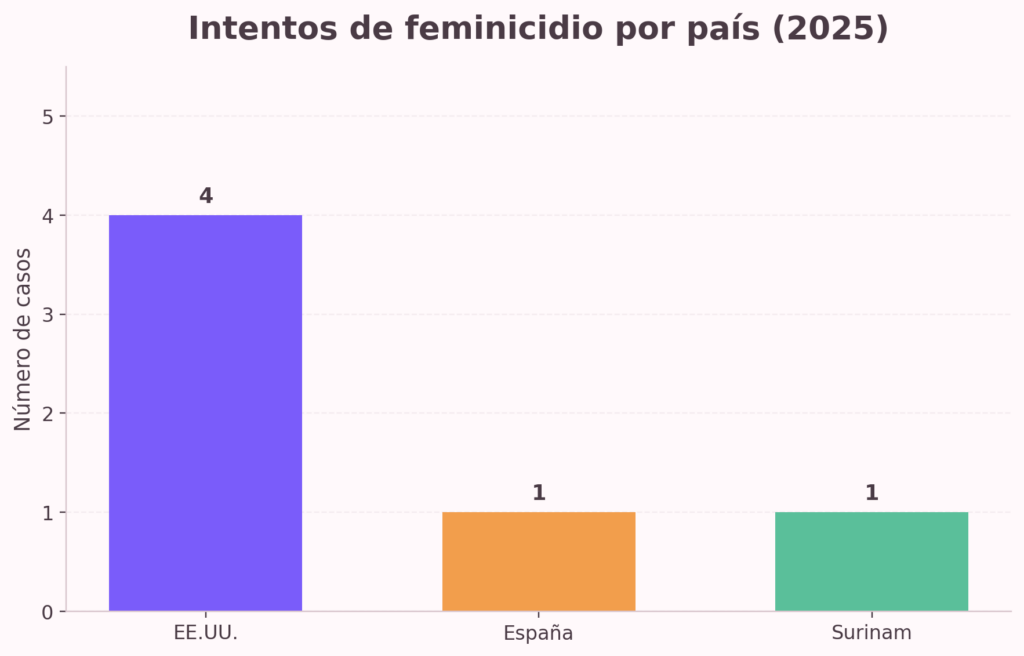 El registro de 2025 muestra una concentración territorial en Estados Unidos, especialmente en Florida, que reúne tanto la mayor cantidad de feminicidios consumados como la mayoría de los intentos identificados. España ocupa el segundo lugar, con dos feminicidios consumados y un intento de violencia extrema no consumada. México aporta dos casos consumados, Guyana uno y Surinam uno. Esta distribución sugiere que la violencia feminicida contra cubanas en el exterior se concentra en corredores migratorios con fuerte presencia de población cubana y altos niveles de precarización o fragmentación de redes de apoyo.